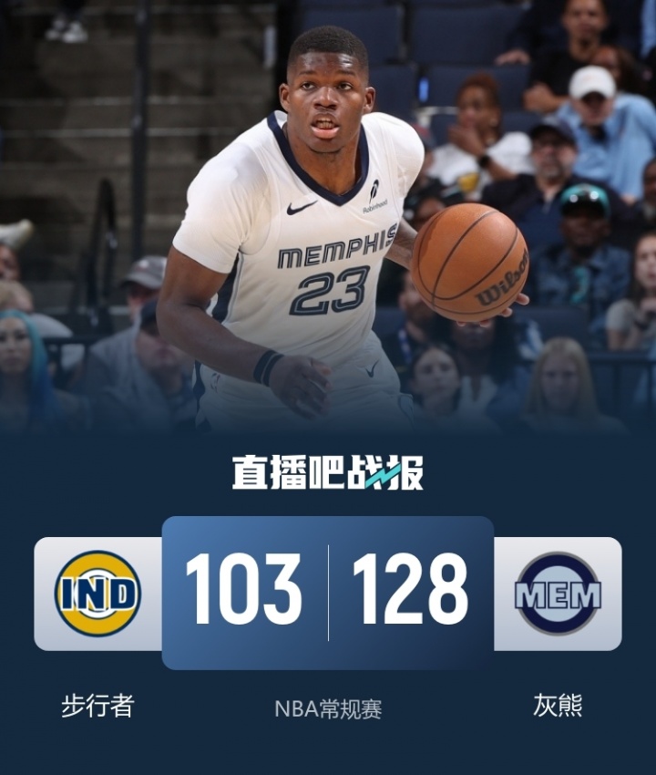 比赛上来,步行者的进攻表现不太好,半节的时间只拿到3分,灰熊一波8-0的小高潮拉开分差,不过整个第一节双方的命中率都不算好,首节后半段一直处于胶着状态,次节灰熊再次打出攻势,半节时间轰出20-6将分差拉开到两位数,半场结束时步行者落后8分;下半场回来,步行者一度将分差缩小到仅剩3分,但之后灰熊再轰12-0稳住局势,这一节灰熊攻下43分,比赛在末节已经提前失去悬念,最终灰熊轻取步行者拒绝连败。